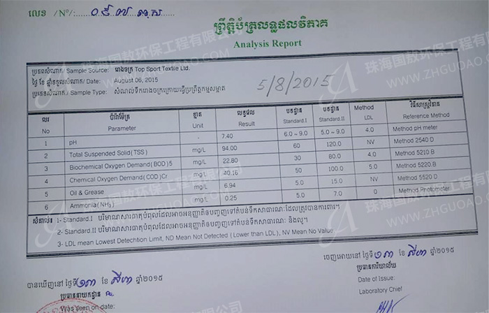 經(jīng)柬埔寨環(huán)保部門檢驗(yàn)結(jié)果COD為40.16mg/L