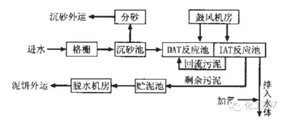 DAT池和IAT池串聯(lián)組成,DAT 連續(xù)進(jìn)水,連續(xù)曝氣(也可間歇曝氣),IAT也是連續(xù)進(jìn)水,但間歇曝氣,清水和剩余活性污泥均由IAT池排出。和典型的SBR 反應(yīng)池一樣,IAT 池運(yùn)行操作由進(jìn)水、反應(yīng)、沉淀、出水和待機(jī)5個階段組成。